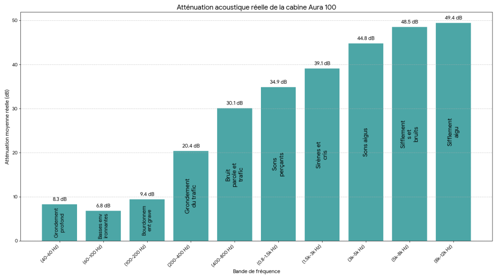 Niveau d'atténuation du bruit à l'intérieur de la cabine dans chaque bande de fréquence :